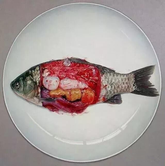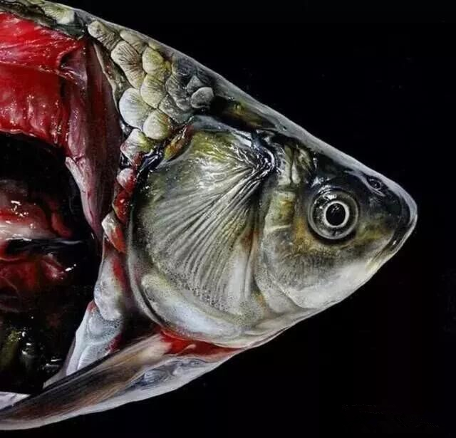同样是画鱼的超现实绘画大师周松,他是从另一个角度对鱼进行了自我的解读。周松的油画水平也是极高的,他是通这解剖学的油画手法,把鱼的内脏和鱼肉切开,然后用自己的绘画功底表现出鱼的一种血XI张力感。