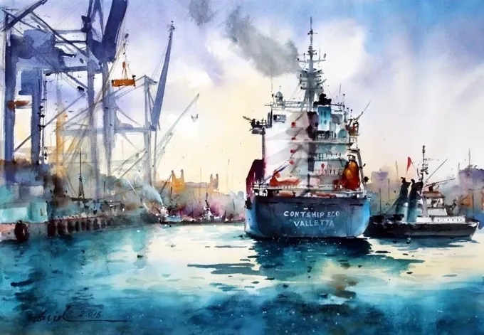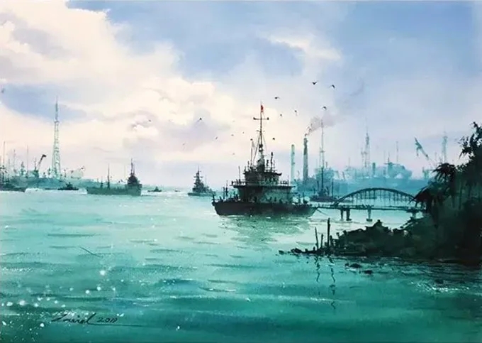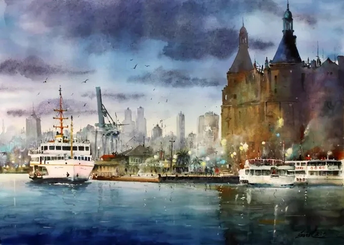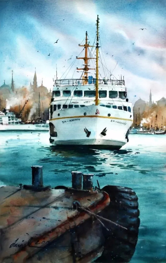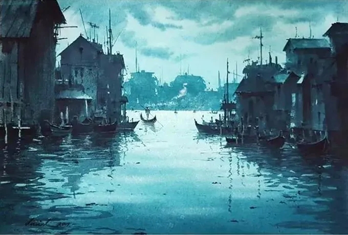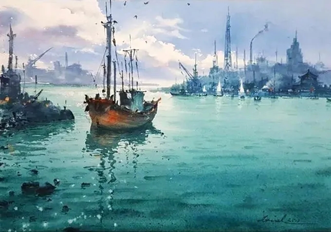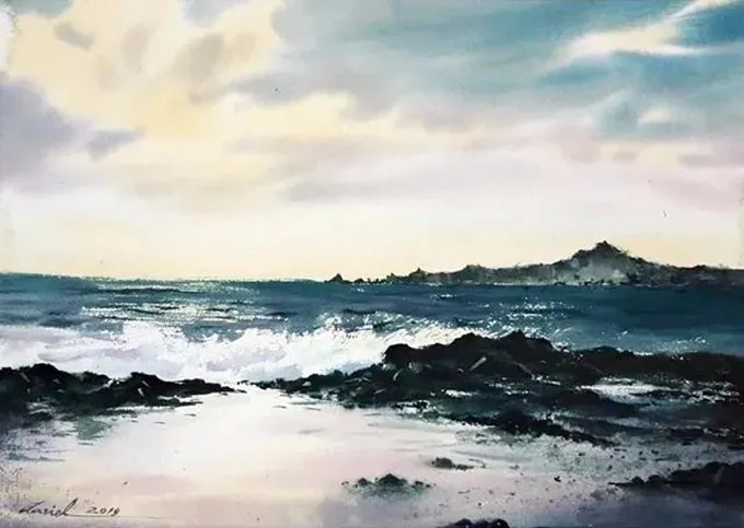 伊朗艺术家贾维德·塔巴塔比,1973年出生于伊朗德黑兰,多次参加土耳其、法国、比利时、日本等全世界多个国家的展览。他的作品整体呈现蓝绿色调,十分具有深意,这种用蓝绿色来表现海天景色,水润感、色彩感都十分充足,是独具魅力的水彩艺术作品。 —— 前言