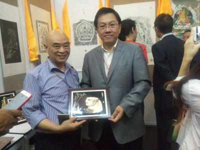 东盟-中国经贸发展促进会常务副会长沈钰淇与柏波及麦秆画作品【熊猫图“春梦”】合影纪念!