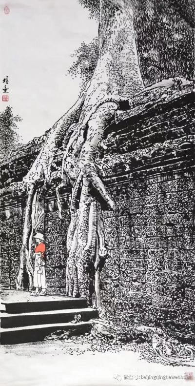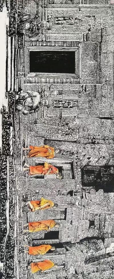 马培童这批作品表现的是中国四大石窟系列,也有柬埔寨吴哥石窟题材,但用的是中国焦墨画的方式。根据所表现的对象,跟传统的中国焦墨画确实在内容和形式上有比较大的差异,他很好地吸收了汉画像石刻的刀法变笔法,笔刻出石雕刻在在宣纸上,让我感觉耳目一新。这些写生创作,画的都很逼真,让我们有身临其境的感觉,现场感很强。130,以笔代刀,刻写石窟。
