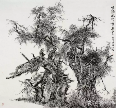 我对胡杨情有独钟,笔下的胡杨,都是黑白色的,但是并不单调,反而充满着张力与生机,给人以澎湃的力量感和无限的希望。而胡杨这种倔强不服输的精神,也正是我所崇尚的人生理念。---人文360视频《徐家康:一位文人画家的风骨与坚持》