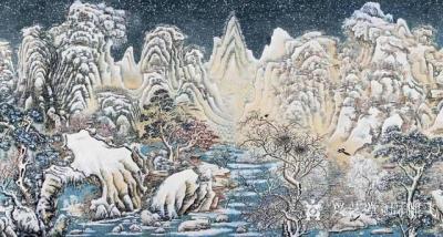 作为恪守古今传统的老画家敢于创新,周经纬先生大胆的将山水与花鸟共融共处,结合创作,画中有怪石、巨岩,神木、灵府、丽宫,更有梅、兰、松、竹,有喜鹊之喳、鸿雁之鸣于山水之间,画面感受到天魂元融、地魄充盈,人气安祥和谐、从艺术上讲画家打破了常规陋习,这个创新、是作者古文修养及古代书画收藏研究的成果的终极表现。他在画中题款中题道“吾之于地气,是真正的体验到大自然的壮观雄伟和美丽。松竹梅等还有花鸟、鸿雁等一切的美景化之我心,提精炼意、再付于画面、来表现当下社会的一过程,大自然的真实感,这就是生活。只有把这些万物生长安排的恰当合理,才能体现人与自然的和谐性。他的画中有动、动中有声,松竹梅兰自古岁寒之友,用来烘托大自然的生机和人类的情感。”虽是雪霁寒天、但是人居处充满了祥和充盈的人气、道庭所在、则是仙源灵府、佛尊灵岸、则时闻钟震。如此各居其所、各享其安、各司其灵。可谓太平盛世。创作这么大画面及人文景观的一幅画、不是一味的求大,而是大中有物、寸土付灵,这是最为难得的空亦不空的艺术玄源。如之、作者灵魂的支柱是前题。再有周经纬先生多年来对中国传统文化的学习和古代书画的考藏研究,参古而漫今,传统给了他巨大的力量,所以必然成就这一结晶。