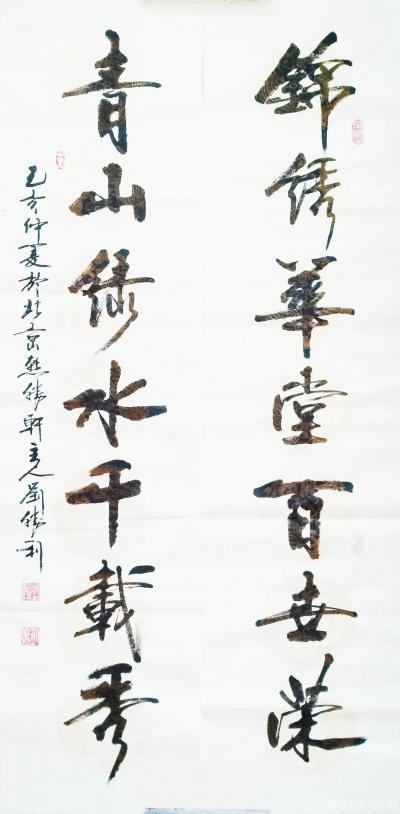 第二幅书法作品是应山东省潍坊市昌邑市王先生之邀而订购四尺对开对联作品《锦绣华堂百世荣,青山绿水千载秀》。这副对联的意思是说,家簇的荣耀千百年来像青山绿水一样长存,长远流传下去。供朋友们欣赏。